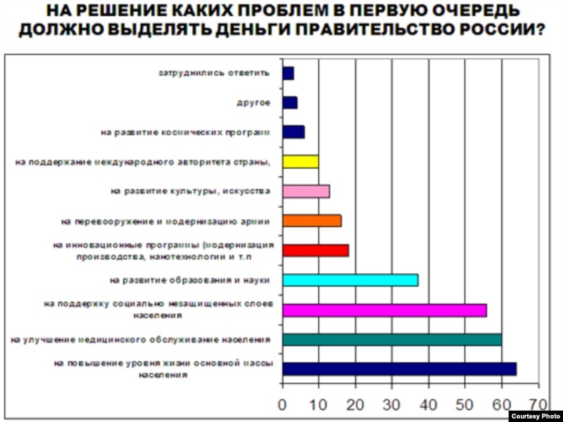 Далее с большим отрывом (37%) следуют вопросы образования, науки и сопутствующие им инновационные программы, затем - модернизация армии (16%). Следующая позиция - развитие культуры и искусства – за это выступают только 13% россиян. Социологи делают, в частности, вывод, что проекты, направленные на усиление авторитета страны на международной арене, сейчас мало волнуют рядовых граждан – за них «голосуют» всего 10% опрошенных, еще менее важными для них являются вопросы развития космических программ.