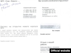 Когда корреспондент Радио Свобода позвонила в компанию PromoHR, чтобы конкретизировать это радостное для репутации компании известие (заказчик, цена заказа), вежливый, судя по его "здравствуйте", оператор сказал, что ничем не может помочь и бросил трубку. Через несколько минут новость с сайта компании исчезла, но осталась в распечатанном виде в редакции РС, также ее запомнил Гугл. Адрес у новости был – www.promohr.com/about/news/mgu-premyer/