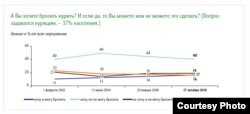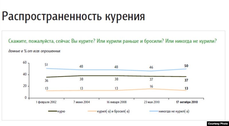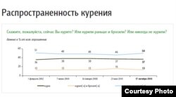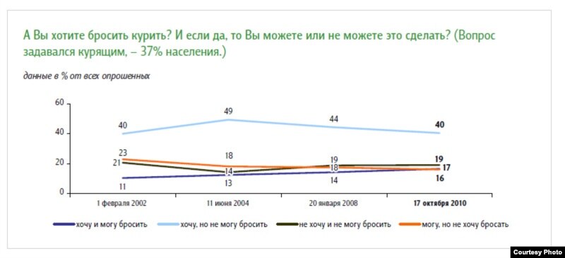 Оказывается, на данный момент курят 37% граждан. 13% удалось избавиться от этой привычки, и половина опрошенных никогда не курили. 40% хотят избавиться от курения, но не могут, 19% признаются в том, что не хотят и не могут бросить курить, а 17% заявляют о своей готовности бросить.