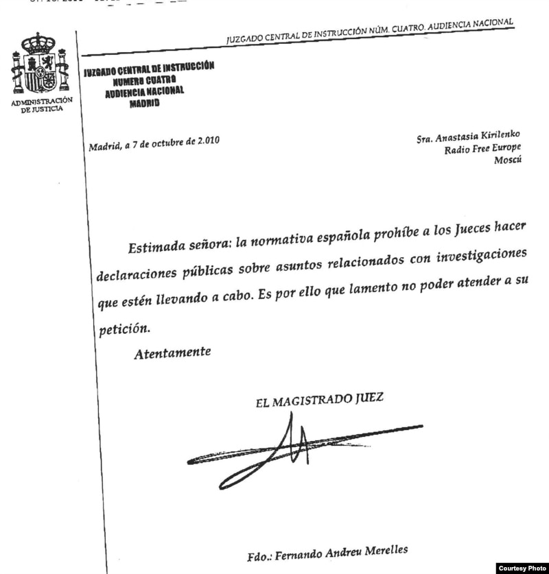 Корреспондент РС направил запрос судье Фернандо Андреу с просьбой об интервью и уточняющими вопросами по делу, в котором фигурирует Олег Дерипаска. Из ответного факса господина Фернандо Андреу следовало, что, согласно испанским законам, судья не имеет право комментировать дело до того, как закончится расследование.