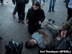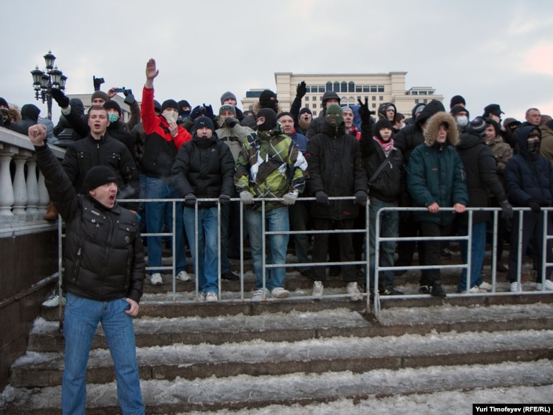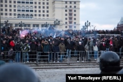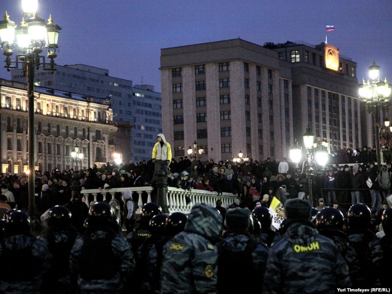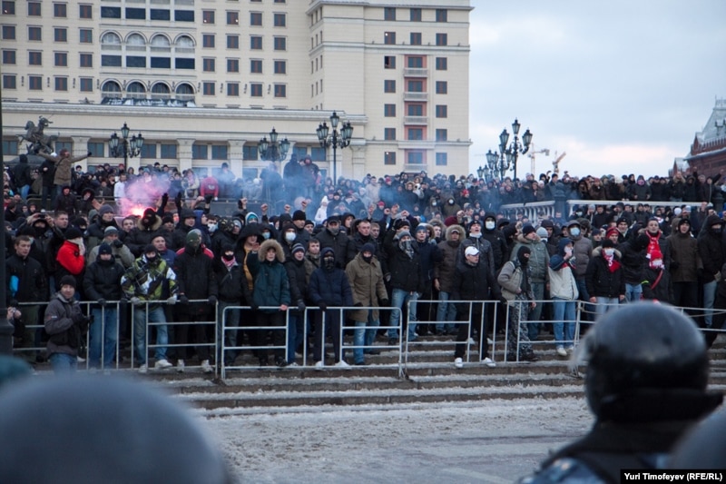 Корреспондент Радио Свобода работал на Манежной площади, где футбольные фанаты, пришедшие с акции памяти убитого Егора Свиридова, устроили погром. Движение на Моховой улице было полностью перекрыто. Сообщения о том, что идет бой между ОМОНовцами и агрессивно настроенной толпой, не подтвердились. Однако толпа спустилась в метро, где стала нападать на граждан с кавказской внешностью.