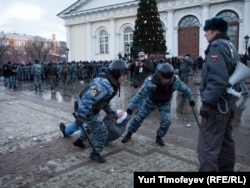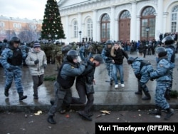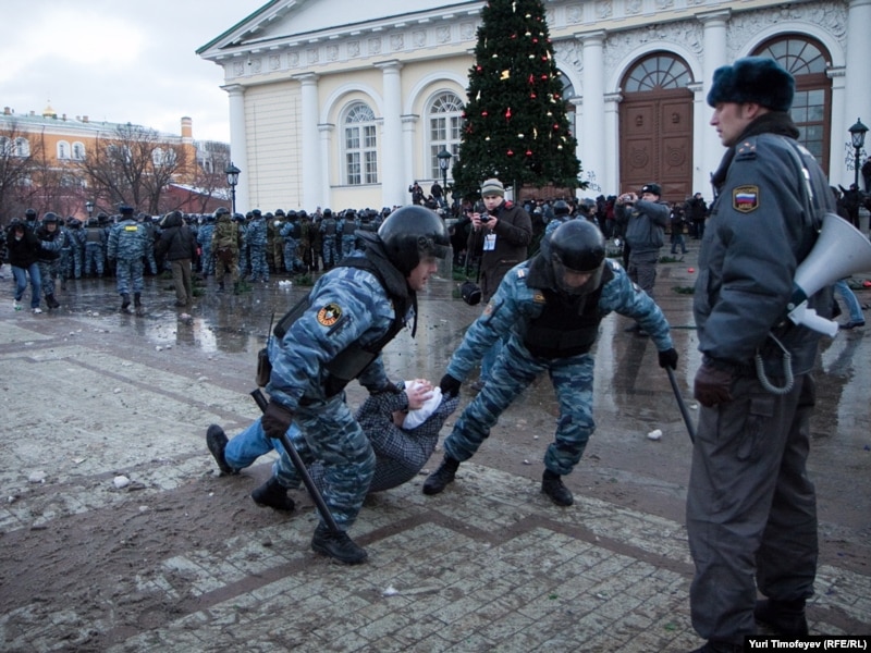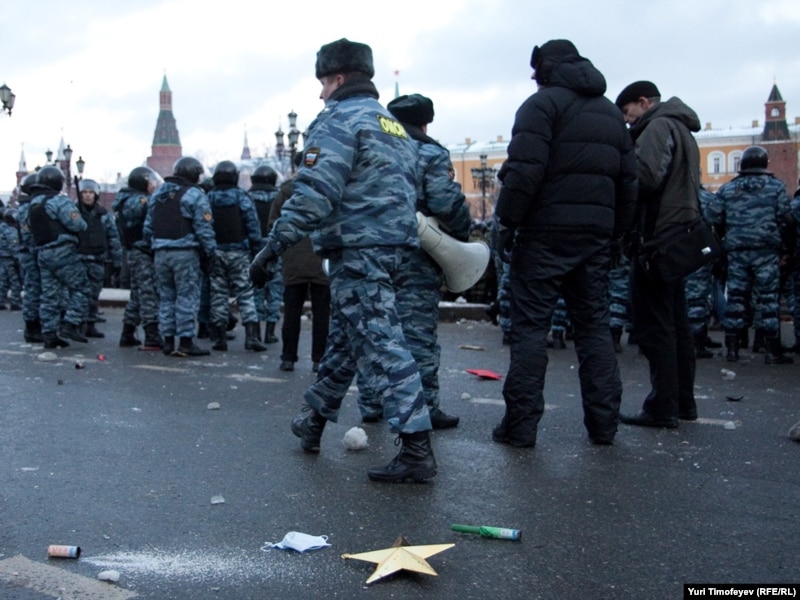 Общее же число футбольных фанатов в центре Москвы – около 3000 человек. Они разгромили огромную новогоднюю елку, установленную на площади и стали забрасывать сорванными с нее игрушками омоновцев. Время от времени в воздух взлетает ракеты, слышны взрывы, по всей видимости, от петард. Все вокруг оцеплено милицией, общее число стражей порядка около 500. По громкоговорителю они призывают собравшихся не поддаваться на провокации и обещают, что зачинщики погромов понесут наказание. ОМОН выдавливает фанатов в сторону метро, в ответ в них летят ледышки и петарды.