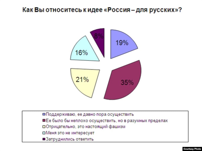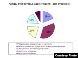 По данным Левада-Центра, на протяжении последних лет большинство россиян поддерживает националистическую идею "Россия для русских". Данные последнего опроса таковы: 19 % россиян заявляют, что ее давно пора осуществить, 35% тоже хотели бы ее осуществить, но в разумных пределах, и только 21% опрошенных отвергают эту идею, полагая, что это настоящий фашизм. Остальных эта проблема не интересует.
