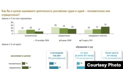 80 % россиян никогда не обращались в суд – такие результаты получил Фонд "Общественное мнение" в ходе всероссийского опроса. Видимо, именно поэтому очень многие - половина граждан - не могут дать оценку деятельности российских судов и судей: они просто не сталкивались с этими инстанциями. Положительно работу судебных органов оценивают 16% опрошенных, отрицательно – 34%. Среди тех, кто обращался в суды в последние годы, количество негативных оценок доходит до 52 %. Главная причина такого отношения – это коррупция, о которой говорят 16% россиян. 9 % заявляют о том, что суды часто выносят несправедливые, незаконные решения. Люди называют и такие причины плохого отношения к судам как несовершенство законодательства, бюрократия и зависимость судов от вышестоящих инстанций. Относительное большинство – 40% граждан – не видят никаких перемен в работе судов в последние годы.