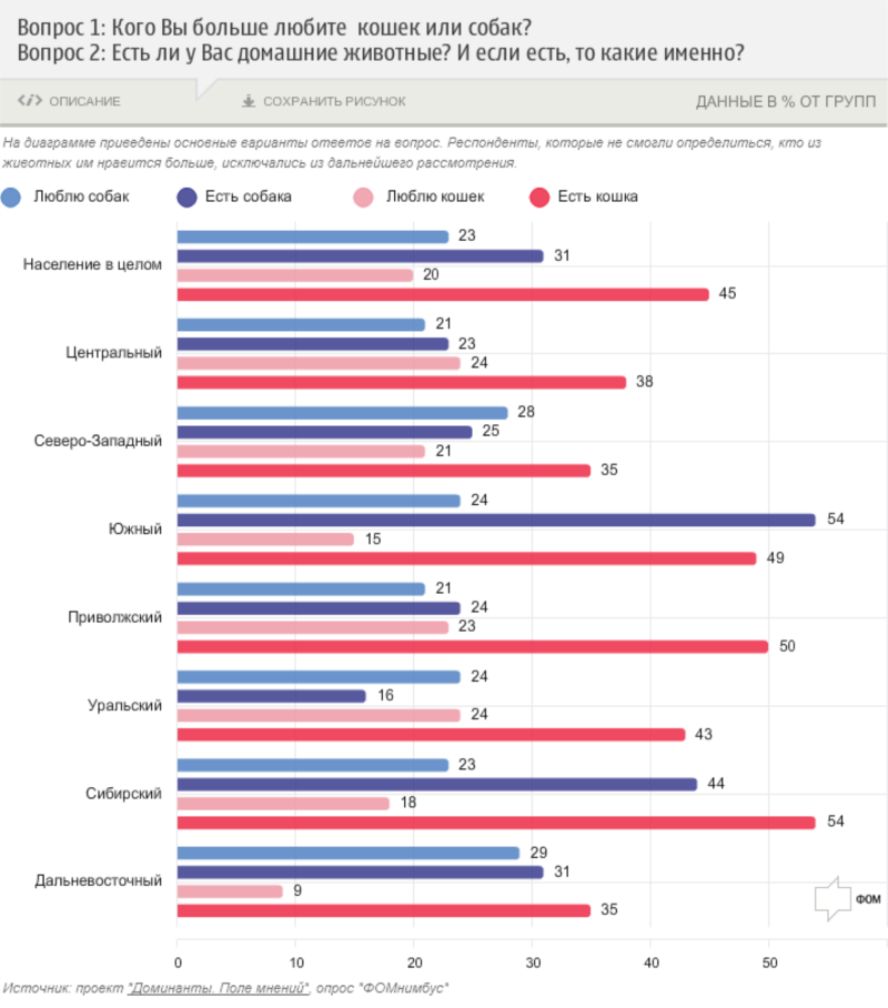 - Получилось, то кошатников немножко побольше, причем больше, как кажется нам, не за счет того, что кошки как-то более глубоко осели в наших сердцах, а просто за счет того, что кошка - более практичное животное. Дело тут не в любви, а дело как раз в суровой правде жизни. Кошки не требуют большого ухода, они мало едят, с ними не нужно гулять. Почему мы говорим, что причина именно в этом? Потому что в 2006 году ФОМ проводил еще один опрос. Наши социологи спрашивали людей, обладающих собаками: «Доставляет ли неприятности вам ваша собака (гуляние, уход и так далее)? Люди отвечал по-разному, конечно. Но если разбить их ответы по степени урбанизации, по тому, в каких населенных пунктах они жили, и выстроить их в ряд: от больших городов, мегаполисов (Москва, Петербург и прочее), - до сел, то мы, что в городах очень маленький процент людей (2%) говорит, что собака не доставляет им проблем. Таких людей меньшинство, потому что им приходится с собакой гулять. Если мы будем двигаться по этой линии дальше - малые города, села, – то процент людей, которые утверждают, что собака не доставляет им проблем, становится все больше и больше. Мы понимаем, почему: в селах собака живет сама по себе - гулять с ней не нужно. Она бегает, приходит домой только ночевать. И в селах процент людей, который утверждает, что собака не доставляет им проблем, их около 90%.