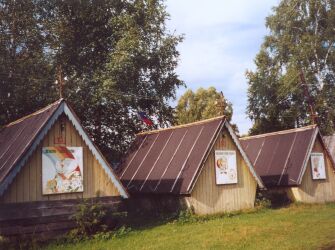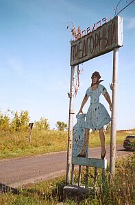 Бытовые недочеты восполняются богатством оформления. На параллельной берегу тропе, чтобы не забыть о романтике - щиты с текстами песен Визбора, в захлебе любви ему приписали и "Бригантину". В конце тропы - ядовито-голубая закусочная "Лесная нимфа". Для верности на вывеску указывает рукой фанерная девушка почему-то в длинном вечернем платье, целомудренно-блядского вида, как в рекламе прокладок. Внутри - зал со сценой и балюстрадой, что-то здесь прежде было иное, торжественное. Выше по склону тянется череда крытых толем домиков-теремков без окон, в которых ночью либо надо открыть дверь и замерзнуть, либо закрыть и задохнуться. На тех местах, где по здравому смыслу должны быть окна - плакаты "Береги природу", "Земля - твой дом", "Познавай свою родину".