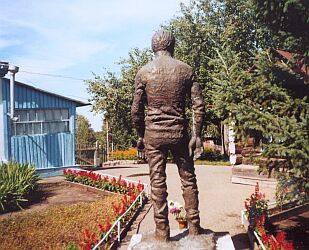 У дома матери Василия Шукшина в Сростках установлен турникет - вряд ли затем, чтоб толпы не снесли в энтузиазме основной мемориальный объект на родине писателя, просто такова алтайская мода: турникеты при входе на турбазы, в дома отдыха, просто на мостики через ручьи (может, самый большой начальник - из вахтеров). Тем не менее мысль о незарастающей тропе и мавзолейной очереди - возникает. Однако Сростки многолюдны только в конце июля, в шукшинские дни: все-таки слишком далеко от чего бы то ни было. Во дворе - бронзовый памятник работы Клыкова. Замираешь перед неандертальским обликом статуи: огромные кисти рук, свисающие до колен, круглые покатые плечи, вместо ступней - некие ласты, плавно переходящие в подножье. С пугающей простотой исполнен замысел - художник, вырастающий из земли, плоть от плоти.