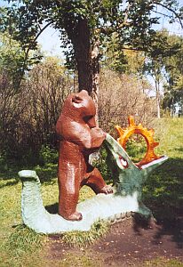 На озерно-холмистом севере Горного Алтая еще теплятся сравнения с южной Шотландией, предальпийской Италией. Только попадаются не замки или шале с цветами и газонами, а редко-редко - стандартно-бетонные поселки. Лежащее стадо коров - рыжей поляной на опушке тайги. Ржавый скелет обобранного до цельнолитой основы трактора. Табун медленно пересекает шоссе. Объект отдыха с деревянной садовой скульптурой: медведь разрывает пасть крокодилу. Крокодил уже сдался и выплюнул солнце, оранжевое колесо катится изо рта, глаза из орбит, но медведь не унимается. Возле пыточного монумента играют в волейбол привыкшие ко всему дети. Под плакатом "Прием шкур КРС" безмятежно пасется КРС, рядом - крупные серые свиньи. Высокие лесистые холмы, быстрые извилистые реки, разновеликие озера: от крохотного с алфавитным названием Ая, единственного подходящего для купания, до огромного Телецкого, в котором с удовольствием купаться нельзя никогда. Новичкам сразу рассказывают, что утопленники нетленными лежат в очень холодной очень прозрачной воде веками.