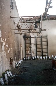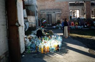 Елена Фанайлова: Голый кирпичный закопченный каркас, выбитые стекла, крыша покорежена взрывом... Бесланская школа номер 1 на глазах людей стала мемориалом скорби. Горожане ходят сюда каждый день. Школа обложена по периметру живыми цветами, сгоревший пол спортзала выложен венками. На стене - распятие. Все это кажется моментальной фотографией ада.