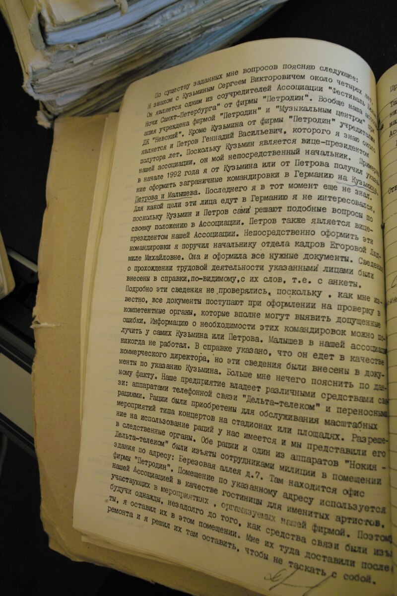 "Малышев в ассоциации "Белые ночи" никогда не работал. В начале 1992 года я получил от Кузьмина и Петрова задание оформить заграничные командировки в Германию на Кузьмина, Петрова и Малышева….В документах указано, что Малышев едет в качестве коммерческого директора ассоциации, но эти данные были внесены по указанию Кузьмина", - говорил на допросах Сергей Драпкин.