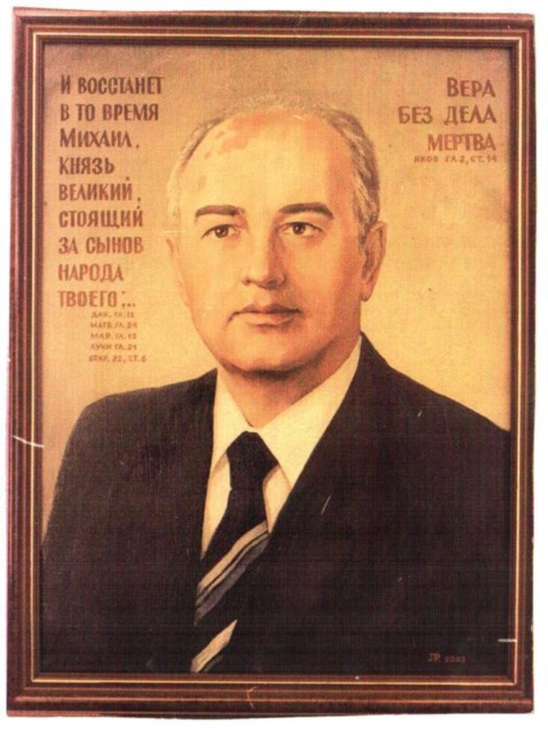 Сергей Фирсов: Это парадокс. Так получилось, что мои коллеги нашли такую странную икону, объяснение которой давать сейчас сложно, но я посчитал важным и интересным поместить ее. Михаил Сергеевич Горбачев в данном случае рассматривается как жертва, последний герой. На этой иконе слова: ''И восстанет в то время Михаил, князь великий, стоящий за сынов народа своего. Вера без дела — мертва''. Я ничего не понимаю.