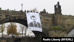 3 ноября на знаменитом Карловом мосту в Праге появился огромный плакат с портретом активиста арт-группы "Война" Олега Воротникова. Воротников за решеткой, снимок сделан в зале петербургского суда. Рядом – плакаты с фотографиями акций "Войны" – "Член в плену у ФСБ" и "Дворцовый переворот". Это акция – часть международной кампании протеста против гонений на радикальных художников и политических активистов в России. Рассказывает автор медиа-арта группы "Война" Алексей Плуцер-Сарно: