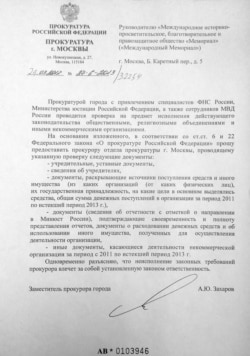 Судя по документу, который был предъявлен прокурорами, им было поручено проверить источники финансирования "Мемориала" и цели, на которые расходовались средства.