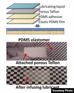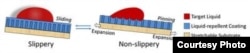 Поверхность материала покрыта жидкой пленкой, которая, в зависимости от размера пор, либо проникает глубже внутрь пористого слоя, находящегося под жидкостью, либо выталкивается наружу. В свою очередь, размер пор зависит от внешнего воздействия. Например, при растяжении поры увеличиваются. В обычном состоянии материал гладкий, плоский и прозрачный, и капли воды или масла с него легко скатываются. Но при растягивании он становится шероховатым, что позволяет удерживать влагу на его поверхности. На языке физиков это называется переменной гидрофобностью: одна и та же поверхность отталкивает или удерживает капли влаги, в зависимости от условий.