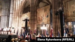 Дело в том, что еще в 1941 году генерал Лекруа заставил своих воинов произносить клятву: "Поклянитесь в том, что вы сложите оружие только тогда, когда наши цвета, наши красивые цвета, будут плыть над собором Страсбурга". Сегодня случилась эта символическая акция. Был туман, поэтому ее детали можно было разглядеть только по местному телевидению. Над собором с флагом Франции кружило какое-то летательное устройство, похожее на большого паука. Потом этот флаг сняли и внесли в собор. Туда же с парада пришли ветераны со своими знаменами. Состоялось торжественное богослужение памяти павших.
