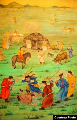 Картины по шелку Осора Будаева поражают не только яркостью, но и скрупулезностью, с которой изображены народные обычаи. Вот картина "Освящение знамени" – ритуал, от которого кровь стынет в жилах: знамя полагалось обрызгать кровью пленника – он и лежит на первом плане, безголовый, а кровь из головы заботливо собирают в чашу. И знамя полощется тут же, сейчас, видимо, оно станет священным. Центральное полотно – "Колесо сансары" с необычными деталями: в сегментах, отведенных человеческим мирам, обычно помещаются символы народов, исповедующих восточные религии, но здесь художник изобразил и символы России: изба, на пороге сидит женщина с ребенком, пасутся гуси, утки, свиньи, есть даже заводская труба с красным флагом, паровоз и самолет. Символ России Будаев ввел в свою танку, буддийскую икону, по просьбе Пандито Хамбо-ламы Агвана Доржиева, который надеялся, что большевистская власть будет лояльна к буддизму.