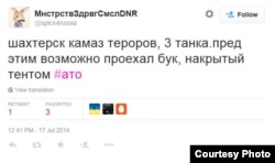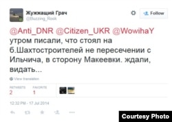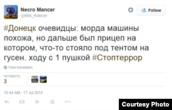 Многие твиты, касающиеся "Бука" (или по меньшей мере крупной единицы боевой техники, которая могла быть "Буком"), были сделаны пользователем @666_mancer. Этот популярный юзер, вероятно, лично не видел описываемые им события, но собирал свидетельства очевидцев с других аккаунтов и делал их перепост у себя. Таким же образом действовал и юзер @WowihaY, который больше не живет в Торезе, но собирает свидетельства местных жителей. Размещение информации о передвижениях сил сепаратистов на собственном аккаунте в соцсетях может быть небезопасным для очевидца, но вполне приемлемым для анонимного юзера или человека, не живущего непосредственно на месте событий. Кроме того, в этих твитах неоднократно используется хэштэг #Stopterror (#Стоптеррор), предназначенный для информирования украинских военных о перемещениях сепаратистов, т.е. речь идет о сборе разведывательной информации местными жителями.