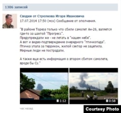 А вот самое известное сообщение, касающееся МН17. Оно появилось в группе "Сводки от Стрелкова Игоря Ивановича" в сети "ВКонтакте". Это не пост, размещенный самим Игорем Стрелковым (Гиркиным), а скорее его "фан-клубом" на основании сообщений с мест. Сразу после того, как стало ясно, что сбит пассажирский самолет, а не военно-транспортный Ан-26, сообщение было удалено.
