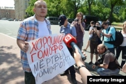 В связи с тем, что на первом пикете, который я устраивал в Липецке, я вышел с плакатом, на котором было написано: "Хороший гомофоб мертвый гомофоб". Но прокуратура не нашла в этом лозунге в итоге никакого экстремизма. Смешно, что я просто перепутал плакаты, этот плакат у меня лежал с Питера, мы нарисовали другой плакат для акции, а я случайно взял снова этот.