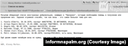 – Cепаратисты очень часто в переписках указывают списки личного состава, свои фамилии, клички и позывные. В одном из таких писем был список иностранцев, которым требуется помощь в получении или продлении виз. Этот список шлет заместитель командира батальона "Призрак" в "Союз добровольцев Донбасса" и пользователю с ником "draft7771" – это Ольга Кулыгина, довольно известный персонаж на Донбассе. Она была задержана в самые первые месяцы начала "Русской весны", а потом очень удачно обменяна. Наверное, человек, которому шлют письмо с вопросом по продлению и получению виз, имеет какое-то отношение к российским органам. И, собственно говоря, этот же email пришел в "Союз добровольцев Донбасса".