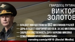 Навальный подчеркнул, что задекларированный доход главы Нацгвардии составляет шесть с половиной миллионов рублей в год. "Золотов лично решает организационные вопросы путинской коррупции. Он тесно взаимодействует с людьми, причастными к ней", – заявил политик.