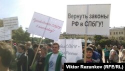 Митинг на Марсовом поле сотрудников, преподавателей и студентов Санкт-Петербургского государственного университета (СПбГУ) собрал более пятисот человек. "Верните старейший географический факультет!", "Руководство СПбГу в отставку", "Без географии нет Санкт-Петербургского университета!", "Восстановить географический факультет в СПбГУ!", “Развал СПбГУ – развал России!”, “Финансы СПбГУ в Контрольно-счетную палату!” – под такими лозунгами проходил митинг. В числе требований его участников, изложенных в резолюции, направленной президенту России Владимиру Путину, требование “остановить административное преследование и увольнение преподавателей, имеющих собственную точку зрения, отличающуюся от точки зрения администрации, на пути развития СПбГУ”.