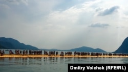 Оказавшись на вокзале в Брешии, откуда уходит поезд в Сульцано, я увидел толпу на одной из платформ и не сразу догадался, что все эти люди стремятся посмотреть на творение Христо. "Плавучий пирс" открыт всего 16 дней, вход бесплатный, и успех превзошел все ожидания: десятки тысяч паломников приезжают на Изео, чтобы пройтись по оранжевой дороге. Возможно, впервые в истории произведение современного искусства стало объектом столь массового поклонения.