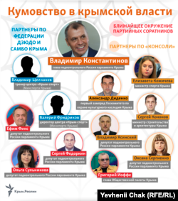 Спикер подконтрольного России крымского парламента Владимир Константинов предпочел окружить себя "старыми крымскими кадрами" – бывшими регионалами, с которыми он прошел не одну избирательную компанию. Также в первых эшелонах крымской власти сейчас работают люди из его строительной корпорации "Укрросбуд" и фирмы "Консоль".
