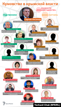Нынешние крымские власти утверждают, что после "референдума" на полуострове полностью поменялись подходы к укомплектованию властных структур. Практика кумовства и коррупции, "как при Украине", осталась в прошлом, утверждают они. Однако, по подсчетам портала Крым.Реалии, минимум три десятка госуправленцев и депутатов связаны родственными, партийными и бизнес-связями с руководителями аннексированного полуострова.