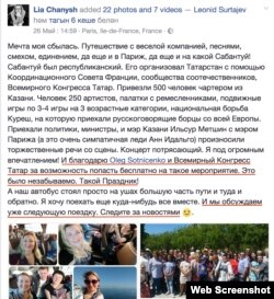 Впрочем, оказалось, что на сабантуй в Париж поехали не только активисты национального движения, но даже люди, не имеющие никакого отношения ни к татарам, ни к Татарстану. Теперь эти "татары на час" у себя в Facebook благодарят Конгресс за предоставленную возможность бесплатно прокатиться в Париж, надеясь, что подобные "халявные" поездки будут организовываться и впредь.