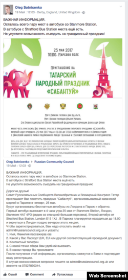 В то же время татарские активисты, не связанные с Россотрудничеством, ничего не знали о том, что Конгресс предоставил автобус для поездки из Лондона в Париж. Диана Яхина из Лондона, например, просила поделиться информацией о запланированных татарских мероприятиях не в каких-то закрытых просоветских сообществах, но и в группе Tatarlar in the UK в фейсбуке, она о предстоящей поездке во Францию узнала слишком поздно.