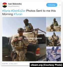 Эксперты CIT обратили внимание, что одна из этих фотографий – человека с автоматом в кузове пикапа – во многих деталях совпадает со снимком, опубликованным Олегом Блохиным в своем аккаунте в социальной сети "ВКонтакте". Оружие – точно такой же доработанный автомат Калашникова, как и на фото "бойцов ЧВК Туран". Сам пикап точно такой же расцветки и с таким же тентом не раз появляется в репортажах Блохина из Сирии. Экипировка "турановца", стоящего в кузове пикапа, до мельчайших деталей совпадает с той, что можно увидеть на фото Олега Блохина из сирийского города Дейр-эз-Зор. В фейсбуке Блохина есть видео, где он едет в этой экипировке по сирийской пустыне в кузове пикапа.