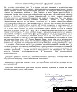 Заявление это, как утверждается, отправлено в администрацию президента. Один из подписавших его в качестве "председателя комитета "Общероссийского офицерского собрания" – Евгений Шабаев, атаман казачьего общества "Ховрино", который в феврале рассказывал о бойцах "ЧВК Вагнера", получивших ранения в бою в сирийской провинции Дейр-эз-Зор.