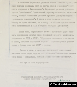 В мае 1987 года появляется докладная записка КГБ "об изменениях в тактике подрывной деятельности "украинской редакции" РС/РСЕ": "Особое место в программах радиопередач рекомендуется уделять темам о якобы имеющих место "нарушениях прав человека" на Украине и насильственной "русификации", клеветническим измышлениям по поводу так называемого "искусственного голода", "репрессий 1937 года"…