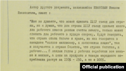 "Сталинскую голодовку пережили, брежневское изобилие переживем", – пишет автор другого письма, назвавшийся Иваном Ивановичем Ивановым. "КГБ приняты необходимые меры по розыску авторов упомянутых документов", – сказано в конце донесения.