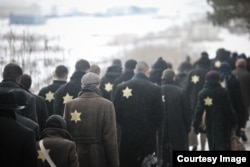 – Это исторический факт: евреев обвинили в том, что они связаны с советской властью, в том, что людей выслали в Сибирь. Немецкая пропаганда доказывала, что евреи и советская власть – это одно и то же, и это якобы объясняло, почему их задерживают, почему их отправляют в гетто и убивают в конце концов. Эта символика взята со старых фотографий, которые во время войны были сделаны в Риге, в Латвии.