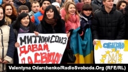 Ровно. На плакате надпись: "Таможенный союз, давай, до свидания". (Считалось, что после отказа от евроинтеграции правительство Украины – под давлением России – будет стремиться к вхождению в Таможенный союз ЕврАзЭС.)
