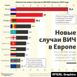 • Эксперты утверждают, что на каждые 100 тысяч человек в России приходится 71 больной ВИЧ, на Украине – 37 случаев, в Белоруссии – 26. В Западной Европе – чуть более шести новых случаев. Самые низкие показатели в Центральной Европе, в частности, в Боснии и Герцеговине, Словакии и Словении.