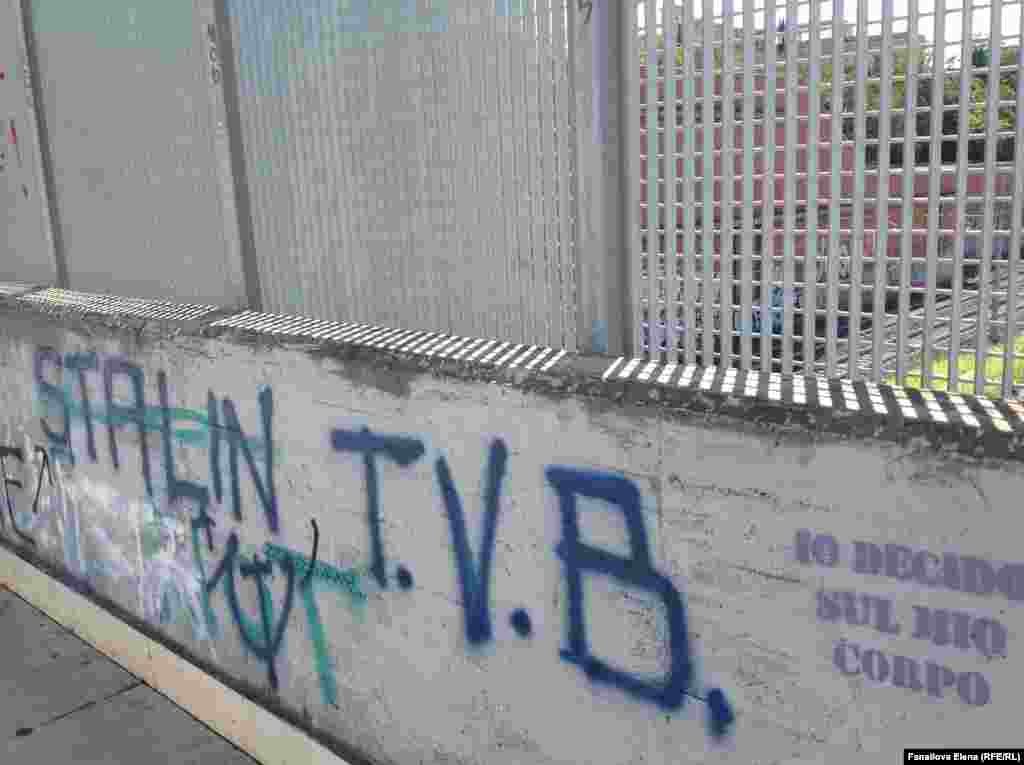 Парадоксальным образом стены пешеходной части моста оказались исписаны граффити "новых левых", где феминистские лозунги соседствуют с апологетикой Сталина и требованиями "свободу Донбассу"