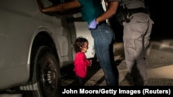 На нём американский пограничник обыскивает мигранта Сандру Санчес из Гондураса на глазах у её малолетней дочери.