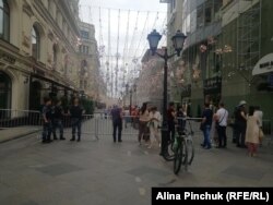 По мере того как демонстранты распространяются по центру Москвы, полиция блокирует улицы. Перекрытая Никольская.