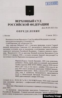 11 июля 2013 Военная коллегия Верховного суда Российской Федерации вынесла определение об изменении приговора Миронову-Королю с контрреволюционных статей на статью о воинских преступлениях. Такое же решение по делу Голубчика Военная коллегия Верховного суда приняла 15 октября 2013 года.