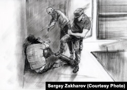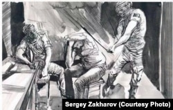Рисунки Захарова – это бесконечная череда замученных людей, в основном лежащих на полу камер, в коридорах и кабинетах с письменными столами, избиваемых вооруженными людьми в военной форме. На них не всегда можно разобрать опознавательные знаки, и, если не знать, что речь идет о происходившем в Донецке в 2014 году, можно вообразить любую тюрьму в тех странах, где пытки стали частью повседневности.