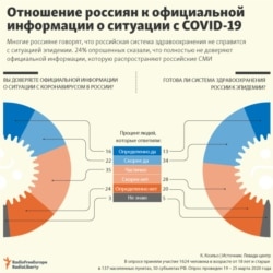 По данным последнего опроса "Левада-центра", большая часть респондентов не доверяет официальной информации об эпидемии коронавирусной инфекции в стране. По вопросу о готовности российской системы здравоохранения к возможной еще более высокой волне заболеваний COVID-19 мнения опрошенных разделились практически пополам.