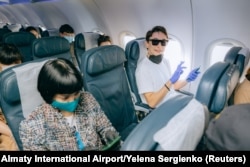 - На первом этапе у пассажиров и экипажа будут измерять температуру тепловизорами (если она выше 37 градусов, не пустят даже в аэропорт). Посадка и высадка пассажиров осуществляется с соблюдением дистанции. Во время полёта бортпроводники и пассажиры должны будут использовать маски и перчатки. На длительных рейсах их будут менять каждые три часа. В салоне самолета пассажиры будут должны снять верхнюю одежду и положить ее на полку для ручной клади. Доставать верхнюю одежду во время полета без уважительной причины будет нельзя. Ремни должны будут быть пристегнутыми во время всего полёта. Очередь в туалет будет контролироваться бортпроводником для соблюдения социальной дистанции. Питание на рейсах будет предоставляться либо в герметичной индивидуальной упаковке, либо будет разогреваться на борту. Пассажиры смогут пронести на борт еду, напитки, детское питание только в герметичной, запечатанной упаковке.