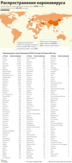 Распространение коронавируса в мире, данные на середину дня 19 марта: