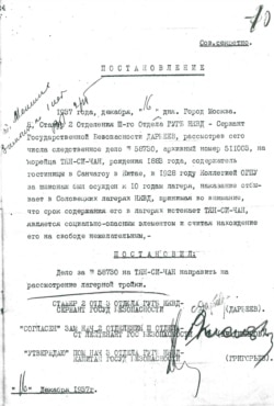 В Соловецкой тюрьме над справками/характеристиками "трудились" начальник Апетер (расстрелян 22.8.1938, в реабилитации отказано) и его помощник по оперчасти Раевский (репрессирован в 1939–1947, реабилитирован в 1955).