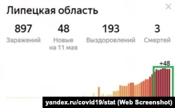 Еще один график (как и предыдущий, он построен Яндексом на основании официальных данных российского правительства) показывает ежедневный прирост новых инфицированных коронавирусом в Курской области. Этот регион не раз назывался российскими экспертами как место частого проявления "электоральных аномалий", когда результаты выборов вызывали подозрения в их искусственной подгонке. С 15 по 25 апреля число ежедневных новых подтвержденных случаев заражения коронавирусом колебалось здесь от 22 до 44 человек в день. 26 апреля был зафиксирован рост заразившихся в полтора раза – 67 человек. С тех пор каждый день это число остается стабильным, не опускаясь ниже 65 и не увеличиваясь больше 74.