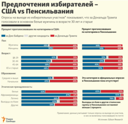 Опросы на выходе из избирательных участков в Пенсильвании показали, что и там средние показатели проголосовавших за Джо Байдена не отличались от средних по США.