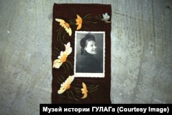– Мы оттолкнулись от каких-то самых узнаваемых или важных слов, которые связаны то с судьбой, а то и бытом заключенного, и подобрали к ним предметы из фондов музея с трогательными, волнующими историями. Допустим, к слову "АЛЖИР" мы показываем вышивку с фотографией. Эта вещь принадлежала женщине, которая сидела в этом АЛЖИРе, то есть Акмолинском лагере жен изменников родины. Здесь же есть такая справочная информация: